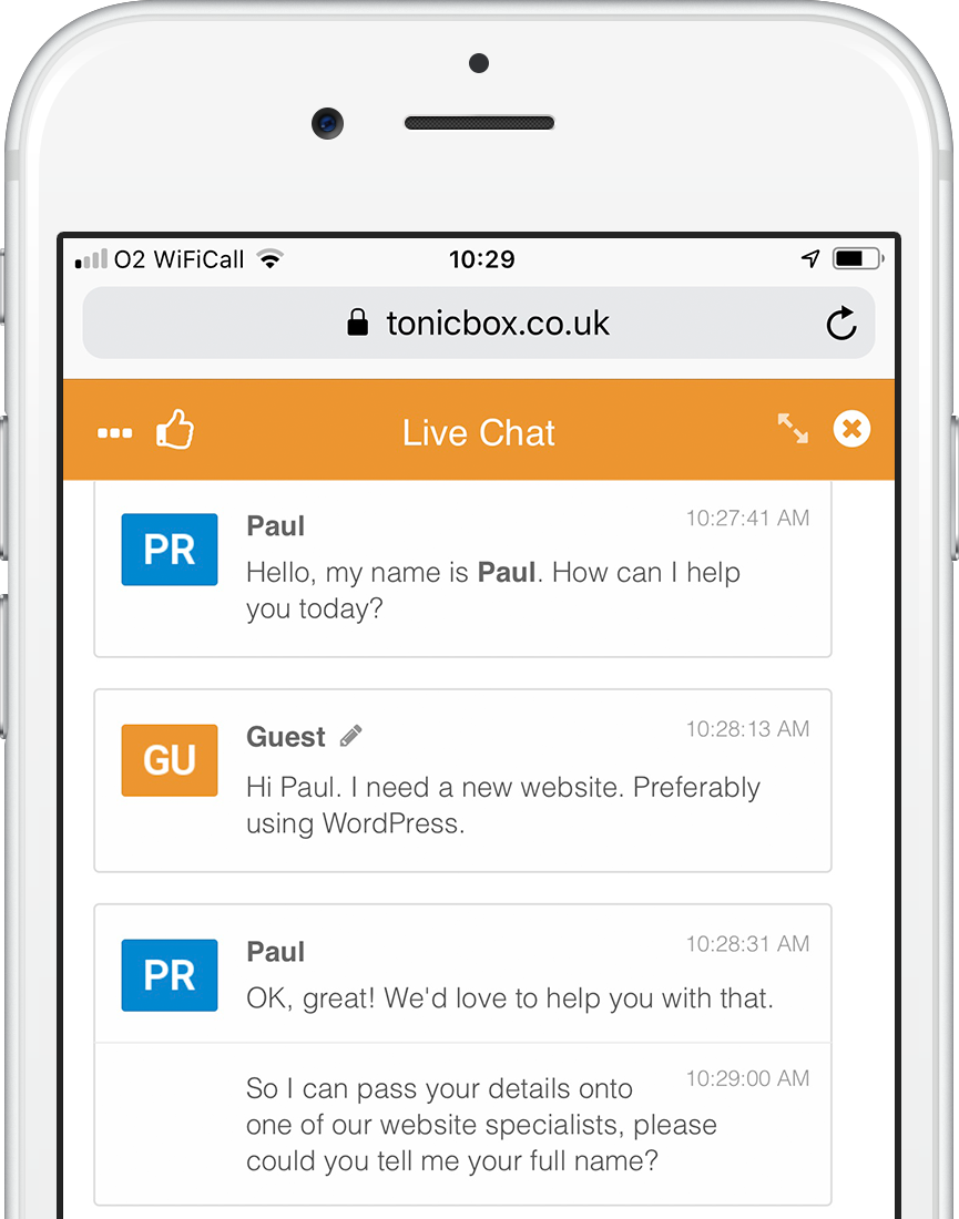 During the on-boarding process we train our live chat operators to understand your business, brand and values, guaranteeing that they act as if they were members of your own staff.